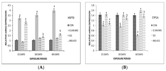 mRNA obtained from liver tissue was reverse transcribed into cDNA and primed at temperature (18S—61 °C, HSP70—59 °C and CYP1A—59 °C). RT-PCR was run with 18S, HSP70 and CYP1A primer. A negative control without a complementary DNA (cDNA) template and no-RT control RNA sample without reverse transcriptase were included to determine the specificity of target cDNA amplification and to control genomic DNA contamination. The PCR reaction efficiency was 2 for the reaction. A significant (p < 0.05) alteration in gene expression was evident, with upregulated HSP70 and downregulated CYP1A gene in response to MG treatment (Figure 6), whereas amelioration (MG + EO) assay depicted modulated expression with values near to the control after 30 days and 60 days.
