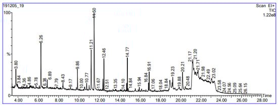 The presence of chemical components in the methanol extract obtained by maceration of B. hispanica was identified by GC-MS after methylation. The results obtained showed that forty-five chemical compounds were identified in the extract (Figure 3; Table 2), among them 2-heptenal, (Z); 2,4-decadiena; 2,4-decadienal; heptadecane; 2,6,10,14-tetramethyl; hexadecane; and 11,14-eicosadienoic acid methyl ester were the chief chemical compounds in the plant extract. The findings of chemical analysis obtained with GC-MS displayed in Table 2 agreed with the results of the total polyphenolic and flavonoid contents presented in Table 1, since both affirm the presence of common chemical classes.