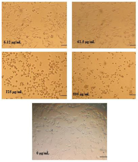 Photograph of cancer cell lines after being treated with B. hispanica extracts. (×10; scale bar = 0.5 cm).