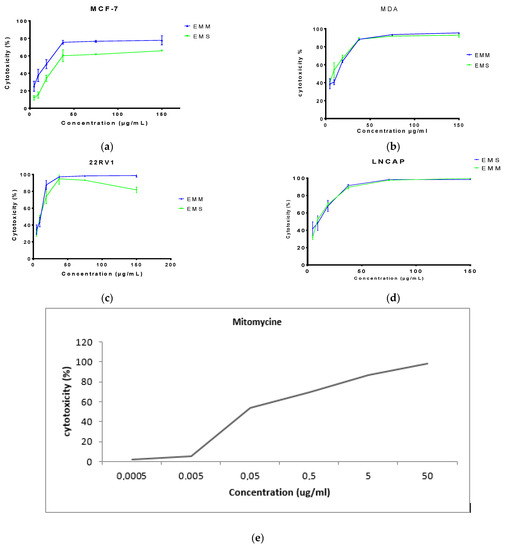 Antiproliferative effect of methanol extracts obtained by maceration (EMM) and Soxhlet (EMS) from Hispanica bark root in MCF-7 (a), MDA-MB-231(b), 22RV1 (c), LnCap (d) cell lines of 72 h post-treatment (concentrations ranging from 4.68 µg/mL to 150 µg/mL for both extracts). (e): Effect of mitomycine used as drug reference towrds all cell lines.