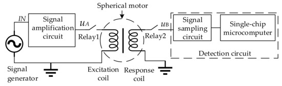 The block diagram of the experimental platform is shown in Figure 4. The excitation coil and response coil are two of the spherical motor coils; the others are not illustrated. Due to the signal generator load limitation, in order to stabilize the amplitude of the excitation signal when the rotor rotates, a signal amplification circuit is installed to amplify the sinusoidal signal generated by the signal generator. The signal source comes from a function signal generator, through an amplification circuit composed of a power operational amplifier and is output as an excitation signal to a stator coil of the spherical motor.