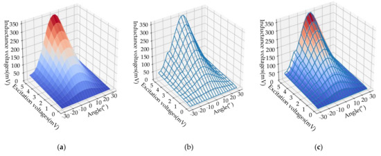 (1) According to the method introduced in Section 2.2, the mutual inductance voltage values and , corresponding to the rotor yaw and pitch motion within 0°–30° for each group of coils, are measured in advance as the interpolation basis for calculating the theoretical value of the mutual inductance voltage. Among them, is the number of 12 groups of stator coils; , , , and are the mutual inductance voltages measured by coil i during rotor yaw and pitch, respectively.