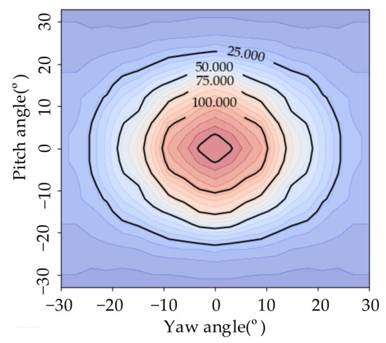 For the same group of coils, the variation patterns of the mutual inductance voltage caused by rotor yawing and pitching are not completely consistent. The test results for the mutual inductance voltage generated in coil group number 5 with the rotor spinning and pitching 30°, respectively, from the initial position, are shown in Figure 8. Due to the difference in the magnetic circuit structure symmetry of the motor, the mutual inductance voltages generated at the yaw angle and pitch angle of the same size are slightly different, which makes the two curves in Figure 5 not coincide, and the contour lines of the mutual inductance voltage present an elliptical shape as shown in Figure 9. Moreover, due to the inconsistent magnetic circuit conditions caused by the difference in processing and installation of each group of coils, the details such as the size and spacing of mutual inductance voltage contour line ellipses measured by each group of coils are also inconsistent. This feature would make the interpolation processing of the mutual inductance voltage contour map not only depend on the position point where the coil center is located, but the voltage gradient direction of this position point would also need to be considered.