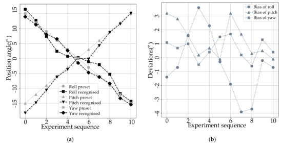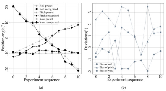 Two motion tracks are designed for the test. The first is to fix the roll angle of the rotor around the X-axis at −10°, the pitch angle around the Y-axis increases from −10° to 10° in steps of 2°, and the yaw angle around the Z-axis synchronously decreases from 20° to −20° in step of 4°. The experimental results are shown in Figure 11. The dashed line is the actual value of the position angle obtained by the contact position sensor, and the dotted line is the detection value of the position angle obtained by inversion according to the mutual inductance voltage.