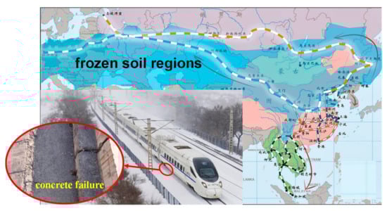 Frozen soil regions are widely distributed throughout the world and are found in places such as Russia, Canada, China, Alaska, and Japan [1,2,3]. Permafrost and seasonal frozen soil cover about 21.5% and 53.5% of China’s land area [4], respectively. The soil mass of subgrade in frozen soil regions expands due to water freezing under low temperature loads; this is referred to as subgrade frost heave, which leads to the deviation of the design elevation of subgrade surfaces and affects the safety of high-speed railway train operations [5]. In recent years, increasing high-speed railways have been established in the frozen soil regions of China, and the operation mileage has exceeded 3000 km [6]. In addition, there are plans such as the Belt and Road Initiative plan to build high-speed railways from China to Moscow and the rest of Europe, with a total length of more than 15,000 km [7,8,9], as shown in Figure 1. CRTSIII slab track will be used as the main track structure in these projects, which will pass through alpine regions where the average temperature in the coldest month in China is less than −10 °C, or the average daily temperature is not higher than 5 °C for more than 145 days. Frost heave in the soil mass is inevitable in these places. Excessive displacement caused by subgrade frost heave will cause the uneven displacement of slab track structures and could even lead to crack failure in the concrete [10]. A field survey of the Harbin–Dalian high-speed railway showed that the slab track concrete had broken away in some sections, as shown in Figure 1, which could in turn seriously affect the slab track’s service performance. It is therefore necessary to pave and maintain the slab track in severely cold regions in order to study the deformation and seams in the track structure of high-speed railways under subgrade frost heave and put forward control limits for subgrade frost heave displacements in frozen soil regions.