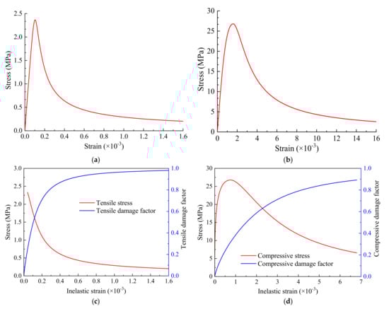By combining Equations (1)–(6), the tension–compression constitutive stress–strain relationship of concrete is obtained. We used C40 concrete as an example; its material parameters are shown in Table 1 and Figure 3.