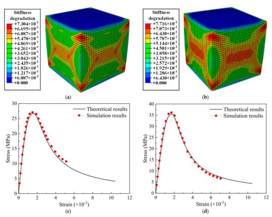 The accuracy of the CDP model is the key to this study. In order to validate the CDP model, according to the validation process in [30], the damage modes of standard concrete specimens (0.15 m × 0.15 m) and the calculation of the stress-strain curves are carried out. The damage nephograms and the stress-strain curves of concrete specimens are shown in Figure 6. The results show that the failure mode of the simulation model is consistent with the one in reality, and the stress–strain curve of the simulation is in good accordance with the theoretical result, which indicates that the CDP parameters of the track structure are reasonable.