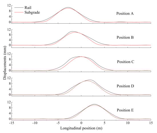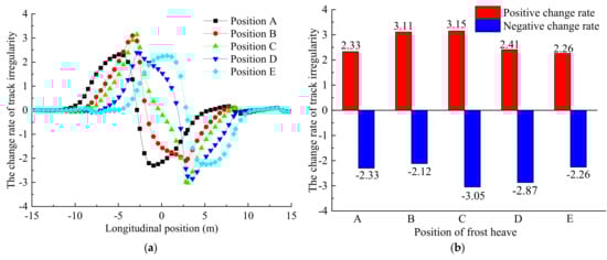 As shown in Figure 10, when frost heave occurs at positions A and E, the rail’s deformation curve is completely symmetrical, and the maximum positive and negative change rates of the track irregularities are (±2.33) and (±2.26), respectively. When frost heave occurs at positions B and D, the rail’s deformation curve is not symmetrical; similarly, the positive and negative change rates of the track irregularities are quite different. This is because the track slab’s end warps under the action of frost heave, which leads to the rail’s asymmetric deformation. When subgrade frost heave occurs at position C, the change rate of the track irregularity is 3.15, which is the highest rate when compared with other positions. In other words, the rail’s smoothness is in the worst possible condition, and therefore more attention should be paid to this issue.