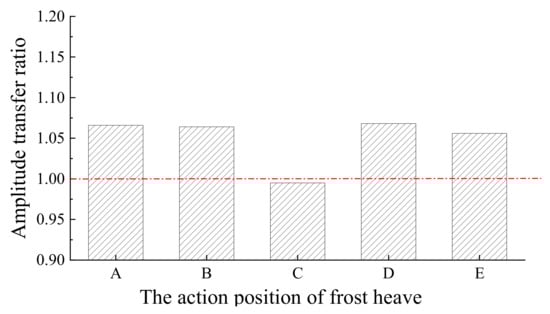 As shown in Figure 9, when frost heave occurs at position C (in the middle of the track slab), the amplitude transfer ratio is less than 1.0. Due to the large rigidity of pre-stressed track slab, the structural deformation is basically consistent with the frost heave curve, and no asymmetry occurs in the longitudinal direction, thereby weakening the rail’s upward deformation trend. When frost heave occurs at other positions, the amplitude transfer ratio is almost the same, which is around at 1.06. In order to reflect the variation trends of track irregularities, the first-order derivation of the rail deformation curve along the longitudinal direction has been carried out to reflect the track irregularity change rate, as shown in Equation (12).