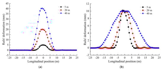 As shown in Figure 11a, when the frost heave amplitude is small, the rail’s deformation curve is basically symmetrical. Moreover, the rail’s deformation amplitude is basically consistent with the frost heave amplitude. When the frost heave amplitude increases, the rail’s deformation increases accordingly. As shown in Figure 11b, when the frost heave wavelength is 40 m, the rail’s deformation curve is basically symmetrical. When the frost heave wavelength decreases, the rail’s deformation curve gradually becomes asymmetrical. When frost heave parameters increase, the range of non-uniform rail deformations gradually increases.