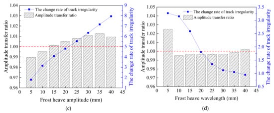 - When subgrade frost heave occurs in the middle of the track slab, the track irregularity’s change rate reaches the maximum value of 3.15, indicating the worst level of track irregularity. The track irregularity’s change rate increases linearly in response to the increase in frost heave but decreases nonlinearly in response to the increase in frost heave wavelength.