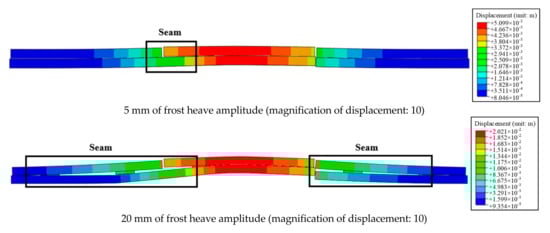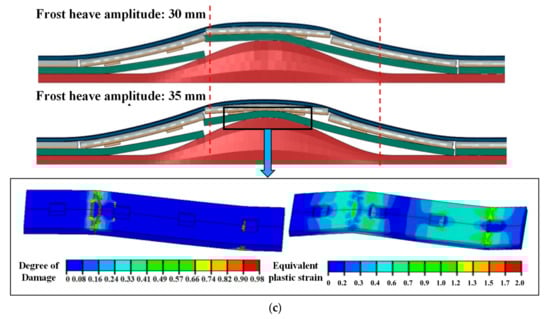 As shown in Figure 14a, the seams mainly appear at the starting positions of frost heave and the expansion joint, and the seam values at the three positions gradually increase as the frost heave amplitude increases. As shown in Figure 14b, when the frost heave amplitude gradually increases from 0 to 30 mm, the seam height increases linearly and the seam length increases nonlinearly. The decreased increment in seam length is caused by the concrete’s plastic damage. This is especially apparent when the frost heave reaches 35 mm, as the plastic damage caused by the base plate is serious due to the tensile stress. That is to say, when the equivalent plastic strain accumulates to a certain value, the concrete located on the surface of the base plate is crushed on a large scale. Additionally, cracks appear along the transverse direction, which leads to the phenomenon of “bending” as shown in Figure 14c. It creates smaller seams between the end of the base plate and the surface of the subgrade. When the frost heave amplitude exceeds 30 mm, the maximum seam height appears at the frost heave’s starting position. When the frost heave reaches 40 mm, the seam length and maximum height increase correspondingly.