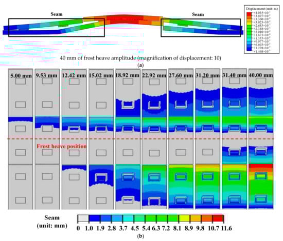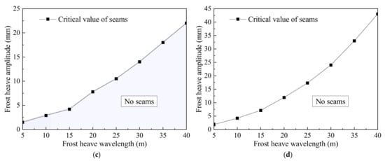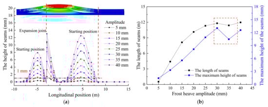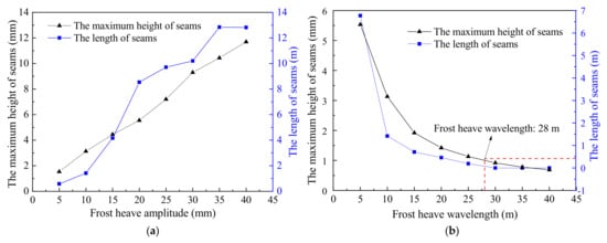 From Figure 13a, when the frost heave wavelength is 10 m, the seam height and length increase linearly with increases in frost heave amplitude. When frost heave amplitude increases from 5 mm to 40 mm, the seam height and length increase by 7.64 times and 22.10 times, respectively. This means that the effects of frost heave are rather obvious. As shown in Figure 13b, when the frost heave amplitude is 10 mm, the frost heave wavelength increases from 5 m to 10 m. The seam height is reduced to 3.18 mm from 5.53 mm, and the seam length decreases from 6.77 m to 1.42 m, resulting in reduction ratios of 43.4% and 79.0%, respectively. When the frost heave wavelength increases from 35 m to 40 m, the seam height is reduced from 0.77 mm to 0.69 mm, and the seam length remains unchanged. That is, as the frost heave wavelength gradually increases, both the height and length of the seam decreases, and the reduction range is gradually reduced. In addition, when the frost heave wavelength reaches 28 m, the maximum height of the seam is 1.0 mm; that is, the seam height gradually decreases in response to the increase in wavelength. There is an indication that when the frost heave wavelength exceeds 28 m, no seam changes occur.