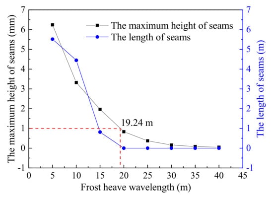 As shown in Figure 15, both the height and length of the seams decrease nonlinearly with increases in frost heave wavelength, and then the two values tend to stabilize gradually. When the frost heave wavelength reaches 19.24 m, the maximum seam height is 1.0 mm; as a result, the height of the seam decreases. In other words, when the frost heave wavelength is greater than 19.24 m, it may be considered that there are no seams.