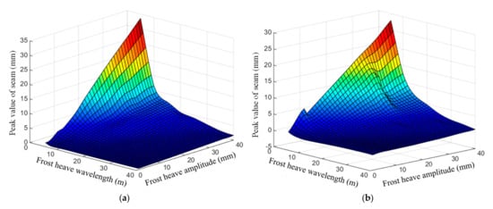 As shown in Figure 16a,b, the seam peak values between the different interlayer structures are concluded under different subgrade frost heave amplitudes (0–40 mm) and frost heave wavelengths (0–40 m). The compound effects of subgrade frost heave displacements on interlayer seams can be obtained. When the frost heave wavelength is small and frost heave amplitude increases, the seam values also increase rapidly; that is, large seams occur easily. Similarly, when the wavelength increases (especially when it reaches 30 m), the seam growth rate shows a sharp decreasing trend. Therefore, it is necessary to pay more attention to these seams under short-wave frost heave. Referring to Figure 16b, it can be seen that the seam value decreases due to the plastic damage of concrete.