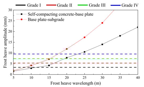 - Based on the relevant standards of slab track irregularity management, the critical values of interlayer seams between the self-compacting concrete and base plate have been selected as the main control indices of subgrade frost heave. Four corresponding wavelength limits (Grades I–IV) are 12 m, 16 m, 19 m and 23 m, respectively.