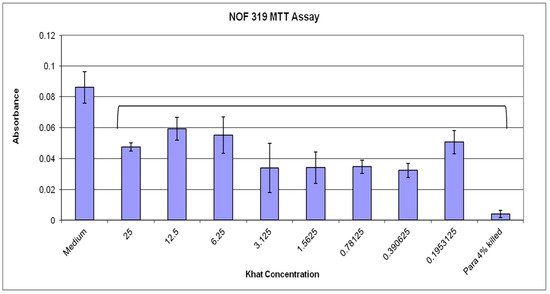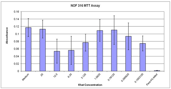 Results for NOF 26 were somewhat different from NOF316, as nearly all concentrations of Khat caused a significant increase in cell death, as compared to the negative control (p < 0.01). A similar response was observed in the positive control and cytotoxicity appeared to be dose dependent (Figure 2).