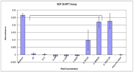Absorbance from MTT Assay for NOF 26 cells treated with different concentrations of Khat solution (25 mg/mL to 0.195 mg/mL). Medium with only NOF 26 was used as a negative control, while 4% paraformaldehyde was used as a positive control showing complete cell death.