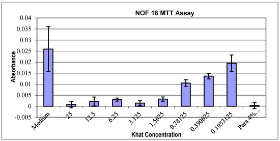 Absorbance from MTT Assay for NOF 18 cells treated with different concentrations of Khat solution (25 mg/mL to 0.195 mg/mL). Medium with only NOF 18 was used as a negative control while 4% paraformaldehyde was used as a positive control showing complete cell death.