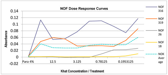 Comparison of absorbance values from MTT Assay for NOF 18, NOF 26, NOF 319, and NOF 316 cells treated with different concentrations of the Khat solution (25 mg/mL to 0.195 mg/mL). Medium only with cells specific for each experiment was used as a negative control, while 4% paraformaldehyde was used as a positive control showing complete cell death. Aqua dotted curve = average of the 4 assays.