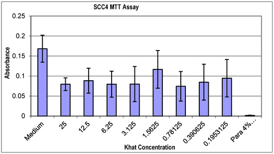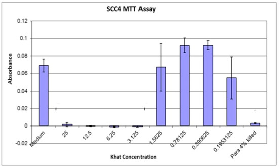 The SCC4 cells also displayed concentration-dependent cytotoxicity. The highest cytotoxicity was seen after cells were incubated with 25–3.125 mg/mL of Khat, which was significantly different from the negative control (p < 0.005). However, lower doses of Khat (1.56–0.19 mg/mL) failed to elicit a significant response, with an increase in number of cells seen with two concentrations (1.5625 and 0.1953125) (Figure 6).