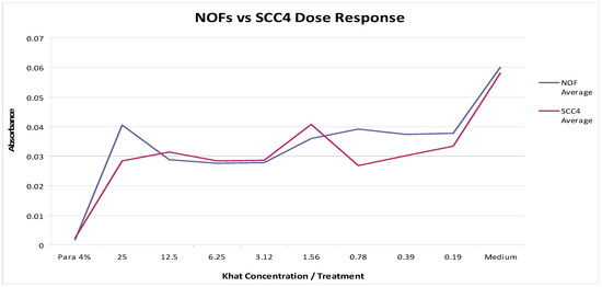 Comparison of dose response curves (MTT Assay) for NOFs and SCC4 cells treated with different concentrations of Khat solution (25 mg/mL to 0.195 mg/mL). Medium was used as a negative control while 4% paraformaldehyde acted as a positive control.