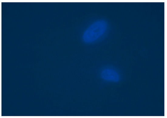 NOF 316 showing nuclear DAPI staining with the IgG antibody. (magnification ×100, Fluorescence at 1.3 s, DAPI at 0.07 s).
