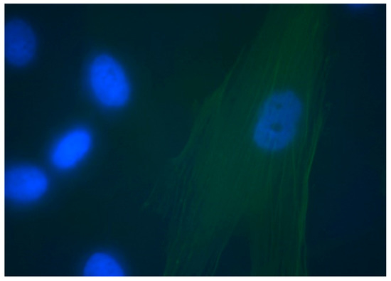 The medium from the 24 well plate was removed and the cells were washed twice in PBS solution, followed by fixation in 100% 1 mL methanol for 10 min. The coverslips were washed once in 0.5 mL of 4 mM sodium deoxycylate in PBS and permeabilized in the same solution for 10 min. Sodium deoxycylate was removed and the coverslips were blocked using 500 µL of 2.5% Bovine Serum Albumin (BSA) in PBS for 30 min, followed by an incubation with 0.5 mL of FITC-conjugated anti-alpha smooth muscle actin antibody (Sigma, Clone1A.4, dilution 1:1000) for one hour at 37 °C, in dark. An IgG isotype antibody was used as a negative control. After 1 h, the coverslips were washed in PBS and placed on glass slides containing 50 µL DAPI (vectorized). Glass slides were kept at 3–4 °C for a day and were viewed using a fluorescence microscope (Zeisss Axioplan 2, imaging with software Proplus 7.0.1. Presence of a green staining was considered to be positive.