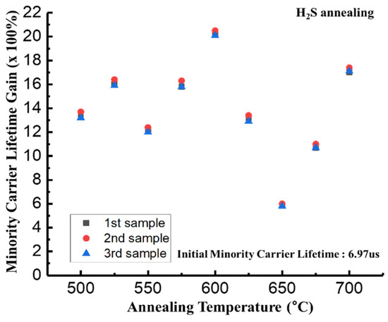 The plot of minority carrier lifetime gains vs. annealing temperature for H2S annealing.