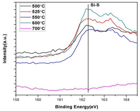Passivation quality was measured with a Sinton WCT-120 instrument. It is widely known that silicon wafers show huge fluctuations in minority carrier lifetime. Due to wafer quality fluctuations, the gain in minority carrier lifetime is used to represent passivation quality. After the wafer cleaning procedure, H2S annealing experiments were carried out to investigate the relationship between temperature and passivation quality. Figure 1 and Table 1 show the minority carrier lifetime gain vs. temperature. In this minority carrier lifetime gain-temperature plot, 2 peaks were observed; one is 1610% at 525 °C, and the other one is 2030% at 600 °C. Yinghuang found that H2 is the desorption product of thermal decomposition of H2S on silicon [9]. Later, Arunodoy experimentally proved that passivation quality on silicon is related to the combined effect of hydrogen and sulfur atoms [14]. Hence, the 2 peaks in the table probably stem from the same passivation mechanism as reported by Arunodoy. Compared with the highest minority carrier lifetime gain (2750%) obtained by Arunodoy, the H2S passivation quality seems inferior. However, it should be noted that minority carrier lifetime gain is strongly related to the silicon wafer properties itself. Specifically, the differences in material properties between the monocrystalline silicon wafer and the multicrystalline silicon wafer used in the previous case most likely resulted in the different upper limits of minority carrier lifetime gain. A large number of bulk defects are known to exist along the grain boundaries in multicrystalline silicon [18,19]. However, in monocrystalline silicon, the absence of grain boundaries means that these kinds of bulk defects are practically negligible. In other words, monocrystalline silicon is superior to multicrystalline silicon in terms of bulk defects. This is also proven by the low initial minority carrier lifetime of multicrystalline vs. monocrystalline silicon. Hence, a more profound gain in minority carrier lifetime can be obtained on multicrystalline silicon by the same method. Moreover, a strange phenomenon was observed: the minority carrier lifetime gain increased again when the annealing temperature was higher than 650 °C. To elucidate this phenomenon, XPS characterization was used to analyze silicon surface composition and further investigate the passivation mechanism. Figure 2 shows the S 2p XPS spectra for the H2S-passivated Si surface. Most conditions exhibit peaks at 162.3 eV, corresponding to Si–S bonds [20]. At 500, 525, 550, and 600 °C, the peaks’ intensity exhibits the same tendency as the minority carrier lifetime gain when the annealing temperature increases from 500 °C to 600 °C. For example, the highest and second-highest peak perfectly corresponds to the largest and second-largest minority carrier lifetime gain. This means that sulfur plays a dominant role in passivation performance. However, it seems that the 550 °C condition does not follow this trend. It exhibits a lower Si–S peak intensity than that seen at 500 °C, but a larger minority lifetime gain. Both hydrogen and sulfur are believed to play important roles in passivation performance. Thus, it is possible that the more positive passivation effect of hydrogen compensates for the loss of sulfur and enhances the total passivation performance to a higher level than that seen under 500 °C conditions. However, there is no peak at 162.3 eV at 700 °C, meaning that no Si–S bonds form on the Si surface after 700 °C H2S annealing treatment. However, a high minority carrier lifetime gain was observed in reality, which contradicted the conclusion that sulfur plays a dominant role in passivation performance. The answer to this conundrum can be found in Figure 3. The peaks at 103.8 and 99.1 eV correspond to SiO2 and Si, respectively [21]. From Figure 3, it is clear that the SiO2 peak is much higher than the Si bulk peak.