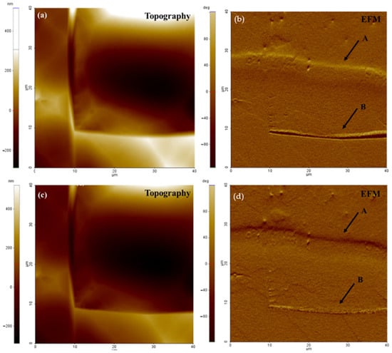 Electrostatic force microscopy (EFM) images of H2S (600 °C)-treated silicon wafers. (a,b) were measured under forwarding bias voltage, while (c,d) were measured under a reverse bias voltage.