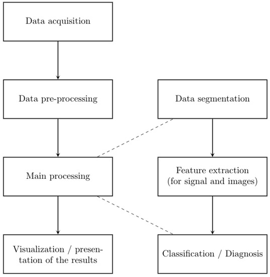 The adoption of computer-aided diagnosis systems to improve the diagnosis of breast cancer [13] and lesions in organs [14] are examples of the numerous applications that are becoming more usual. Figure 1 shows the four steps, followed by a generic structure of a computer-aided diagnosis system, as suggested by Triantaphyllou [15] and Yanase and Triantaphyllou [2]. The details of each step are determined by the input data structure and the nature of the results required by the application scenario. Among the considerable amount of supervised learning approaches, one of the most well-known classifiers in computer-aided diagnosis systems is decision trees (DTs). Other classifiers commonly employed in this area include support vector machines, artificial neural networks, and k-nearest neighbors. Furthermore, it is well known that ensemble-based classifications tend to reduce bias and variance, producing more stable classification results [16,17,18]. Examples of general approaches include bagging and boosting, presenting a trade-off between accuracy and sensitivity to outliers. Variants of these general approaches are random forests and AdaBoost, which have been found to present comparable performance, and following the principle of no-free-lunch, the selection should follow a careful experimental trial.