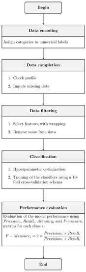The process pursued to evaluate the system was summarized in the five phases shown in Figure 2; this process was based on the general structure of a computer-aided diagnostic system (see Figure 1). The first phase is the coding of the data by assigning categories to the numerical labels. Then, the missing information in the medical records must be completed using imputer methods. The third phase was to filter the data by removing noise from the data and performing a feature selection process to classify the data. The fourth phase was the classification of the data, which included optimizing the hyperparameters of the selected classification methods and their subsequent training using the cross-validation technique. Finally, an evaluation of the results was made using some performance metrics. The five phases of the methodology are detailed in the following sections.