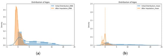 (a) Distribution of the age data using the K-nearest neighbor (KNN) imputer; and (b) the distribution of age data using simple imputer.