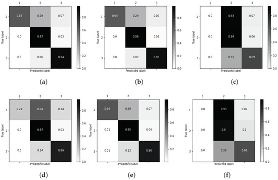 Further performance analysis can be retrieved by analyzing the confusion matrices for each classifier. Confusion matrices in Figure 4 summarize the predictability of each model: the dark gray colors represent high values, whereas light gray colors represent low values. Comparing Figure 4a–f, the highest level of correctly classified samples is provided by XGBoost: Figure 4b. Here, most of the errors occur when class 1 (deceased patients) are confused with class 2 (unhealthy patients).