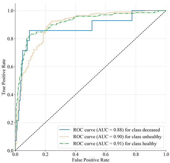 ROC curves that show the system performance for each class (e.g., discharge diagnosis: deceased, unhealthy, and healthy). The diagonal dashed line represents a random classifier that does not consider any information to make decisions.