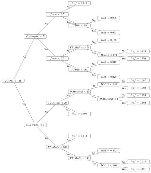 According to Chen and Guestrin [39], the resulting probabilities of decision trees can be computed using the logistic function. As shown in Figure 6, the resulting decision tree allowed identifying malformations of the digestive tract, firstly the atresia of the esophagus. This was identified in the node (), where it makes the code Q39 (ICD10).