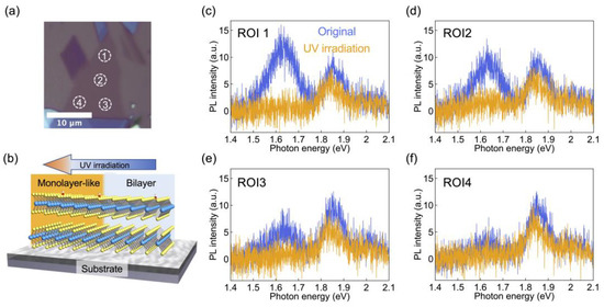 (a) Optical microscope image of the bilayer MoS2. The labels are the measurement regions (regions of interest (ROIs) 1–4) in Figure 3c–f. (b) Illustrative image of the modulation to the bilayer sample via the UV irradiation process. The process induces the bilayer to a monolayer-like state. (c–f) PL spectra for the as-exfoliated (original, blue) and the UV-irradiated (orange) samples in (c) ROI 1, (d) ROI 2, (e) ROI 3, and (f) ROI 4 in Figure 3a.