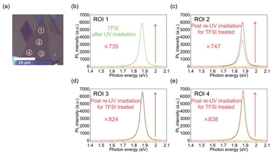 (a) Optical microscope image of the bilayer MoS2 after the TFSI treatment followed by the UV irradiation. (b–e) PL spectra for the TFSI treatment (green) and the second (re-)UV irradiation (red) in (b) ROI 1, (c) ROI 2, (d) ROI 3, and (e) ROI 4 in Figure 4a. The values in Figure 4b–e are the magnitude of the PL enhancement in the sample over the as-exfoliated (original) sample.