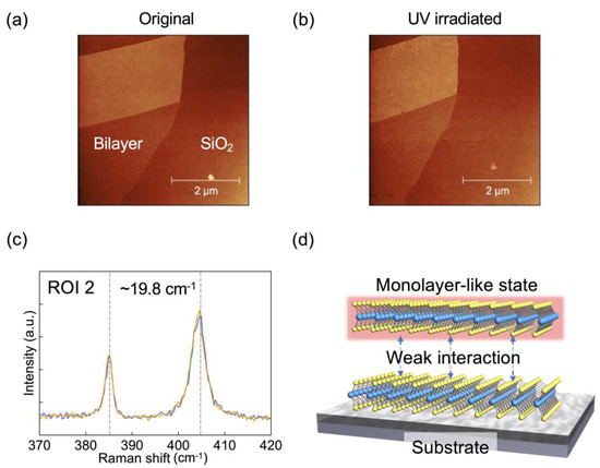 (a,b) Atomic force microscope (AFM) images for (a) the as-exfoliated (original) bilayer MoS2 exfoliated with the weight and (b) the UV-irradiated bilayer MoS2. (c) Raman spectra for the original (blue) and the UV-irradiated (orange) bilayer MoS2 in ROI 2 in Figure 3. (d) Illustrative image of a plausible state of the bilayer MoS2. The top layer would show a monolayer-like state due to the weak interaction between the top and bottom layers by a sort of misalignment of each layer.