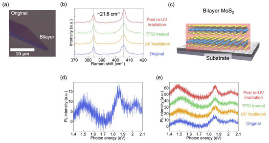 To further confirm the process with a conventional, non-twisted bilayer MoS2. We prepared bilayer MoS2 without using the weight simply by contacting bulk MoS2 with a Si/SiO2 wafer and exfoliating a bilayer flake (Figure 6a). The Raman spectrum showed E2g and A1g signals with a peak separation of 21.6 cm−1, corresponding to a typical (non-twisted) bilayer MoS2 (Figure 6b,c) [19,40,41]. The PL measurement for the bilayer MoS2 showed an indirect band gap around 1.5 eV and a direct band gap nature around 1.86 eV, respectively. The indirect band gap obtained without the weight showed a downshift from the bilayer signal exfoliated via pressing with the weight. These PL and Raman tendencies indicate a non-twisted bilayer MoS2 via the exfoliation process without pressing with the weight. Then, the non-twisted bilayer flake was applied with the whole process of UV irradiation, TFSI treatment, and supplemental UV irradiation. Raman spectra showed almost no change in the process, even though the signal of the A1g showed a bit of an upshift because of the surface oxidation by the TFSI treatment. The PL signal also maintained the structure during the whole process. Therefore, the conventional, non-twisted bilayer flake did not show the conversion to a direct band gap. As in the above considerations, the observed direct band gap conversion in the bilayer MoS2 would be a sort of separation of the top and bottom layers. One explanation is that the conversion would happen in the twisted bilayer case because of the weak interaction between the top and bottom layers, and it facilitates the separation to the ML-like situation by the external perturbations.