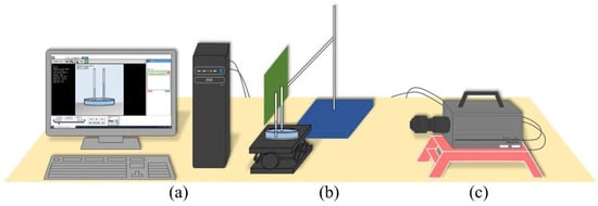 Schematic of the experimental setup. (a) PC and monitor, (b) capillary tube and liquid, and (c) high-speed camera and lens.