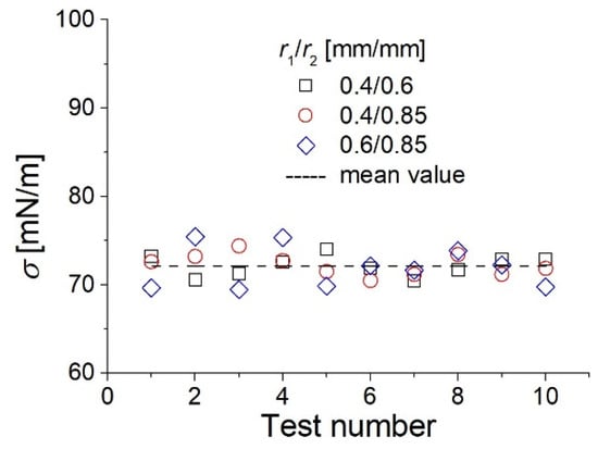 studies where σ is the surface tension (mN/m), g is the standard gravity (m/s2), ρ is the density of the liquid (kg/m3), r is the capillary radius (mm), and Δhe is the difference in equilibrium height (mm), which is experimentally measured at the rise height (h) (t → ∞); r1 is larger than r2. The σ for DW was measured with three capillary tube combinations (r1/ r2 = 0.8/1.2, 0.8/1.7, and 1.2 mm/1.7 mm). The measurements were conducted at room temperature (23 ± 1 °C), and the results are presented in Figure 3. The mean value of each test case was 72.17, 72.27, and 71.99 mN/m at r1/ r2 = 0.8/1.2, 0.8/1.7, and 1.2 mm/1.7 mm, respectively. Thus, the mean value of σ for DW was 72.13 mN/m at 23 ± 1 °C, which was consistent with a known value of 72.29 mN/m at 23 °C [25].