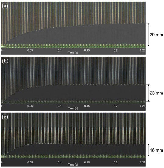 Figure 4 shows time series of images for DW, demonstrating the movements of the meniscus during 0.25 s, with different capillary tube radii. In every result obtained at the tube diameter—at 0.4 mm (Figure 4a), 1.2 mm (Figure 4b), and 1.7 mm (Figure 4c)—the location of the meniscus exhibited a common trend with time. In the very early stage of the capillary rise near 0.05 s, as shown in Figure 4c, the rise profile in the vertically oriented tube increased nonlinearly with time. Then, the rise degraded over time. The rise height corresponding to the meniscus location at 0.25 s decreases from 29 to 16 mm, with increase in the tube radius from 0.4 to 0.85 mm. As shown in Figure 3 and Figure 4a, the maximum rise height at r = 0.4 and 0.6 mm was 29 and 23 mm at 0.25 s, respectively. However, the maximum value (17 mm) was observed at 0.08 s and not at 0.25 s, as shown in Figure 4c. This phenomenon, called meniscus oscillation, has been previously reported by researchers [13,26,27]. The main reason for the oscillation is that the kinetic force may lead to the oscillation. More precisely, meniscus oscillation occurs when the boundary layer of viscous grows at a slow pace with low viscous forces, and keeping liquid inertia to balance the capillary and gravitational force only. In other words, the viscous force restrains the meniscus oscillation energy out while fluids rise up in the tube having radius [23]. In addition, this oscillation is affected by liquid temperature and capillary tube diameters [28]. According to the study by Zhmud et al. [29], such oscillations occur when the aspect ratio (tube radius/equilibrium height), r/he, is approximately greater than 0.05. In this study, aspect ratios for tube radius/equilibrium height, 0.4/36.1, 0.6/24.1, and 0.85 mm/16.1 mm, were 0.011, 0.025, and 0.053, respectively. Another criterion proposed by Masoodi et al. [30] describes the occurrence of oscillations and involves using a dimensionless number, ω, as follows: