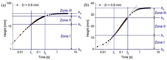 Figure 5 shows the rise height (h) of DW in time (t), which is plotted as log 10 to magnify the differences in the h at the test case of r = 0.4 mm. The capillary rise has several stages [31]: the first stage is purely dominated by inertial forces, the second is where the influence of viscosity increases (visco-inertial flow), and the third is when the effect of inertia becomes nil and the flow becomes purely viscous. According to proposed analytical solutions in the previous studies [16,31,32,33], the capillary rise for the stages I–III can be expressed by Equations (3)–(5), respectively: