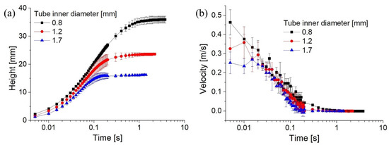 Effect of tube diameter (2r = 0.8, 1.2, and 1.7 mm) on capillary rise dynamics of DW. (a) height and (b) velocity.