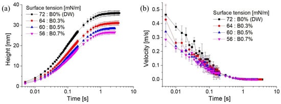 Experiments were performed in a single capillary tube (r = 0.4 mm) at room temperature (23 ± 1 °C) to evaluate the effect of liquid surface tension on the capillary rise dynamics. Based on the measurement method shown in Figure 2, the σ values of the test materials for B0% (DW), B0.3%, B0.5%, and B0.7% were approximately 72, 64, 60, and 56 mN/m, respectively. The values of σ were consistent with the measurement results obtained from the pendant drop method [41,42] with SmartDrop (SmartDrop Plus HS, Femtobiomed Inc., Gyeonggi-do, South Korea). The measurement σ values for B0% (DW), B0.3%, B0.5%, and B0.7% in the pendent drop method were 72.32 ± 0.42, 64.25 ± 0.73, 60.02 ± 0.67, and 56.19 ± 0.57 mN/m, respectively. The addition of n-butanol in a low concentration causes a considerable decrease in the interfacial tension of water/butanol mixtures. This phenomenon stems from the property of pure n-butanol that has a relatively low surface tension (24 mN/m) compared to DW (72 mN/m). For this reason, the surface tension of the butanol-added solutions sharply decreases with increasing butanol concentration until it reaches a critical concentration, after which the surface tension decreases monotonically. The critical mass concentrations of alcohol/water solutions with butanol, pentanol, and hexanol were 3%, 0.5% and 0.3%, respectively [43]. In general, the σ of n-butanol/water mixtures as well as other alcohol/water mixtures depend on their corresponding temperature and composition, and even at low n-butanol concentrations of 0 to 1 wt%, the σ value varies [43,44]. Figure 8 shows the capillary rise dynamics for four different concentrations of n-butanol/water mixtures with different values of σ. Generally, as shown in Figure 8, all measurements show that the height of rise increases with time; however, the velocity of rise at which the meniscus moves through the capillary decreases over time, as shown in Figure 8b. In addition, the height of rise decreased with an increase in the concentration of n-butanol. In particular, he was 35.9, 32.1, 28.7, and 26.6 mm at B0%, B0.3%, B0.5%, and B0.7%, respectively. The viscosity, which depends on the concentration of blends, can be one of the parameters that plays an important role in capillary dynamic parameter because the viscosity can be changed due to the blends during the rising period. To calculate the equilibrium capillary rise height (he) that is considered as steady state characteristics of blends, Equation (3), using the surface tension of the blends and well-established and widely used by the balance of gravity and capillarity, was used [45]. As shown in Figure 8b, the higher the σ of the mixtures, the lower is the maximum instantaneous rise velocity. At B0%, B0.3%, B0.5%, and B0.7%, the peak velocity values were 0.45, 0.41, 0.34, and 0.3 m/s, respectively. The peak velocity when comparing σ values was observed at the same position on time basis (0.005 s), as shown in Figure 8b, unlike the peak values observed at different positions when comparing the capillary radii shown in Figure 7b. In Figure 8b, the peak value decreases systematically with σ because there is no oscillation phenomenon, as shown in Figure 4.