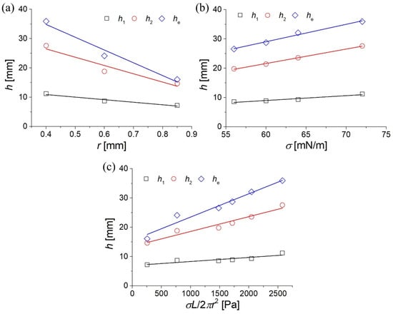- There were some correlations between the characteristic heights (h1, h2, and he) and the capillary tube radius and liquid surface tension. Characteristic heights showed a linear decrease in the capillary tube radius and a linear decrease in the liquid surface tension. Consequentially, each characteristic height exhibited a linear function of the consolidated quantity of σL/2πr2.