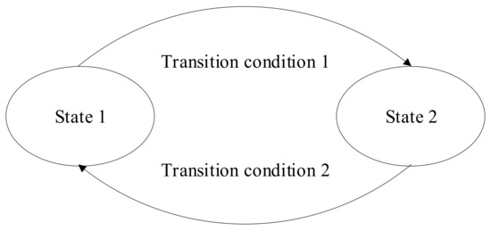 Then, according to the formal graphical representation method [44,45], the conversion method of failure logic is expressed. As shown in Figure 2, we use circles to indicate the state of the component and arrows to indicate the transition relationship between states. The content on the arrow is the mathematical description of the failure logic using the failure deviation, and the conversion condition of the state is expressed in simple and clear language.