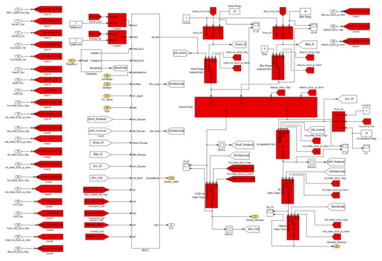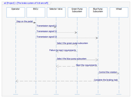 The sequence diagram of SysML can explain the behavior rules in FFIP, as shown in Figure 6. This model represents the following behavior process. After the operator presses the pedal, the BSCU subsystem receives the work instruction and transmits the signal outwardly. The selector valve receives an S1 signal and selects the green pump subsystem. The green pump subsystem returns error data to the selector valve, making it select the blue pump subsystem. The blue pump subsystem returns the correct data. Then, the blue pump subsystem performs the task of controlling the wheel rotation. Finally, the correct operation of the wheel is generated and fed back to the operator. Thus, this task has been completed.